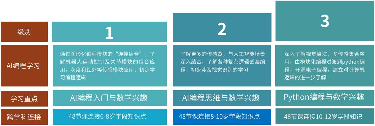 共计3阶144节AI编程课程,跨学科连接6-12岁学段知识点,